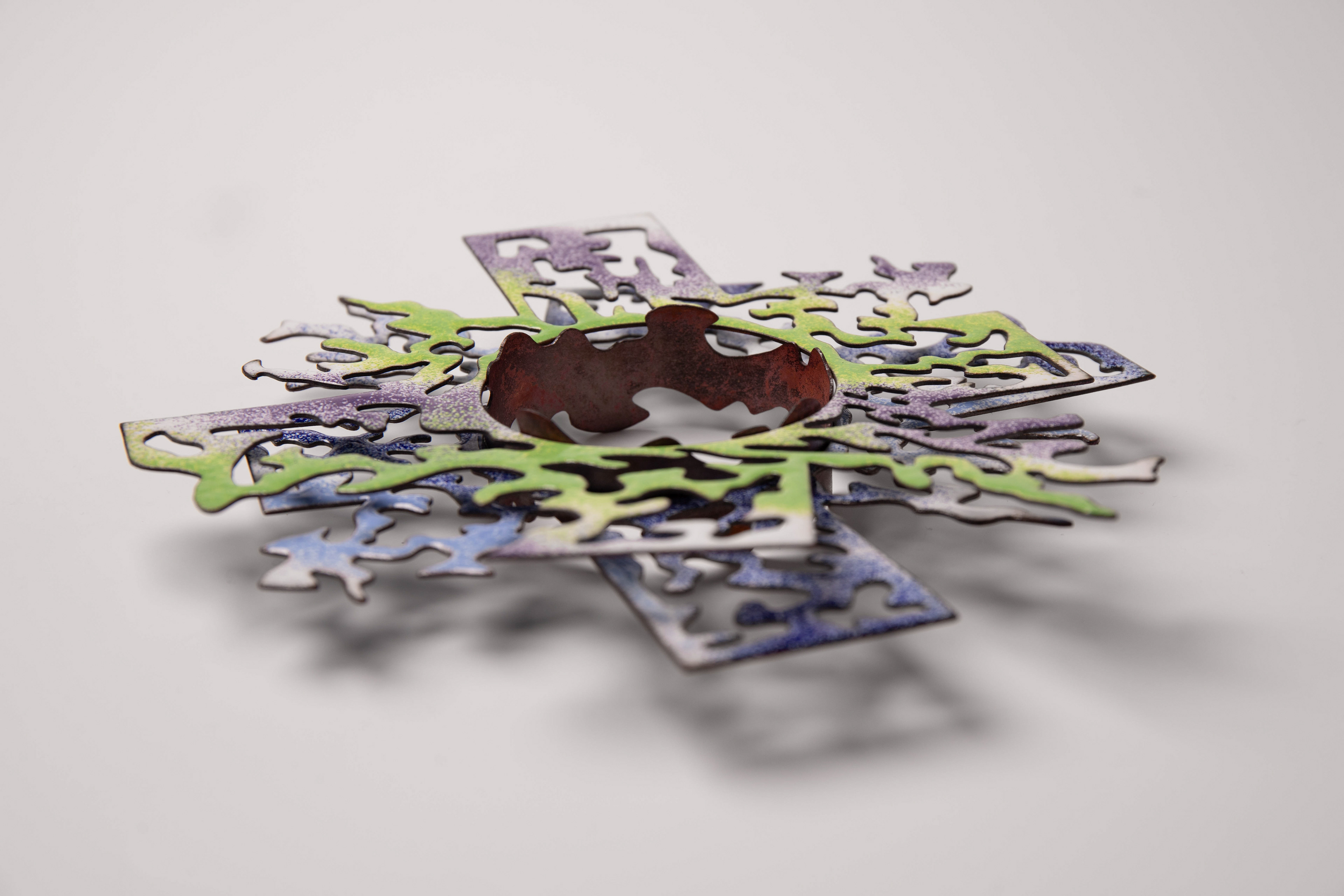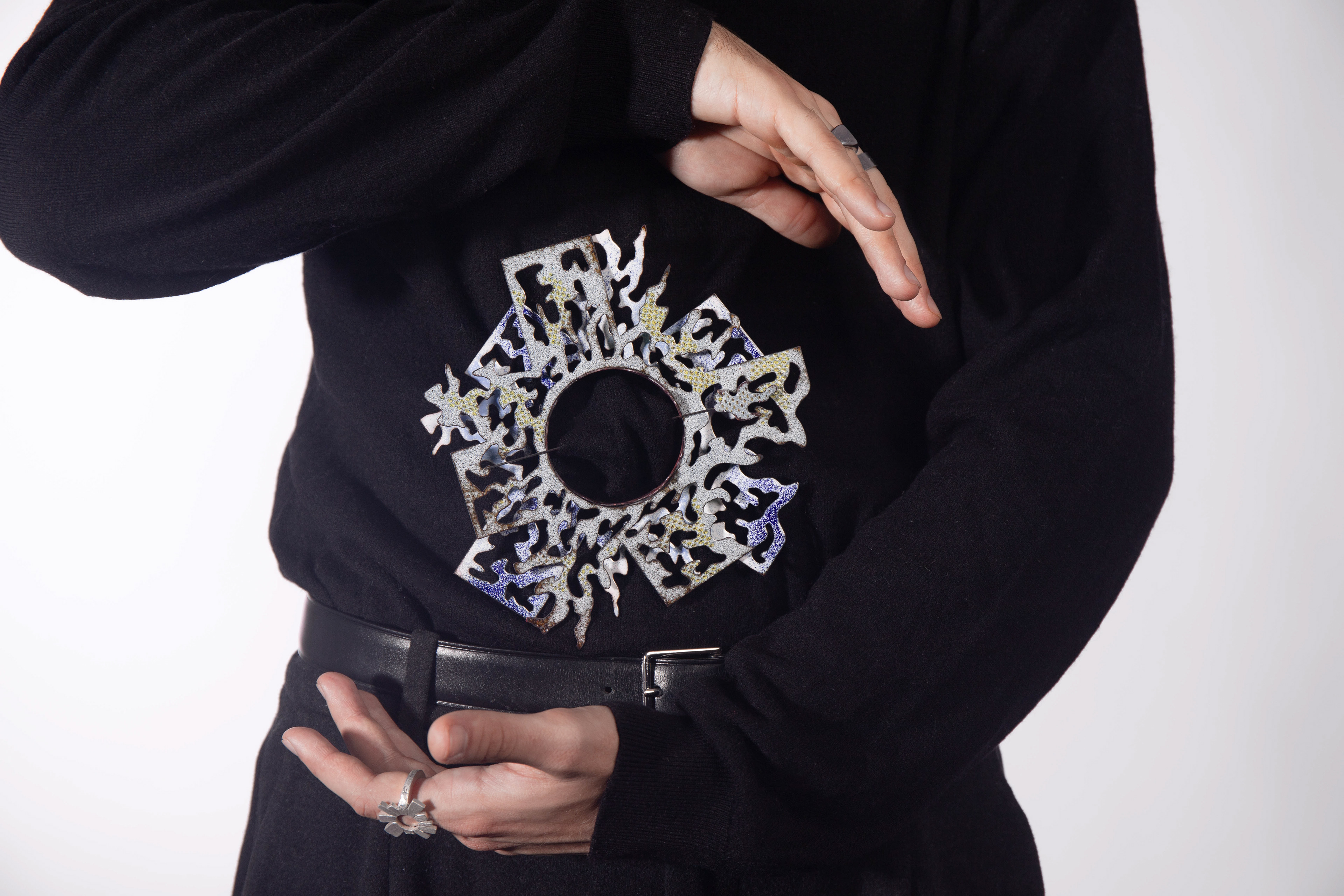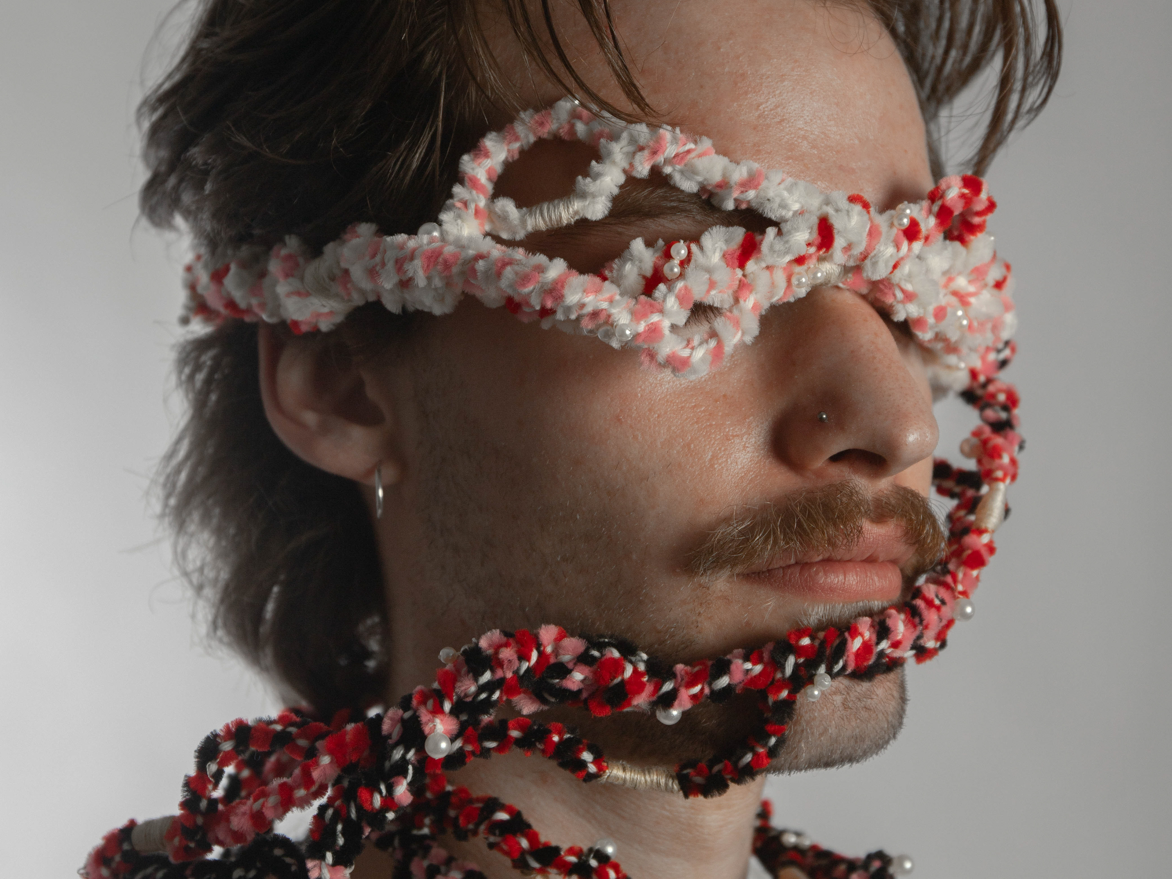As a queer person, how much of yourself do you reveal? Glory on Glory on Human exists in a constant interplay between the need to be open and the fear of the wrong looks that come with this openness. It is thus simultaneously a dividing barrier of anonymity, communication about sexuality/intimacy, and a kaleidoscope of queer love and community. Since the constellation of the object is determined by the person wearing it, the object is only complete with them.