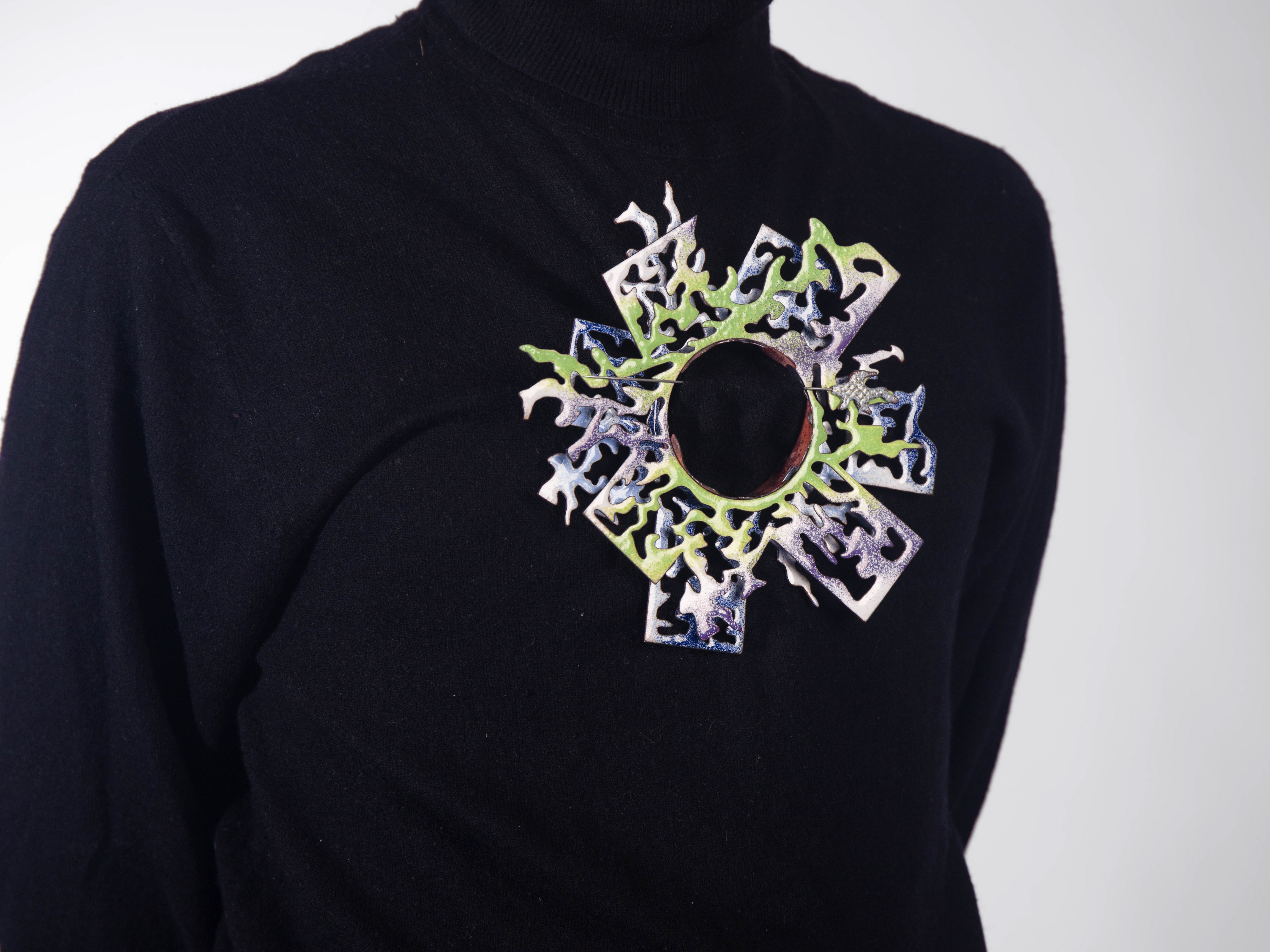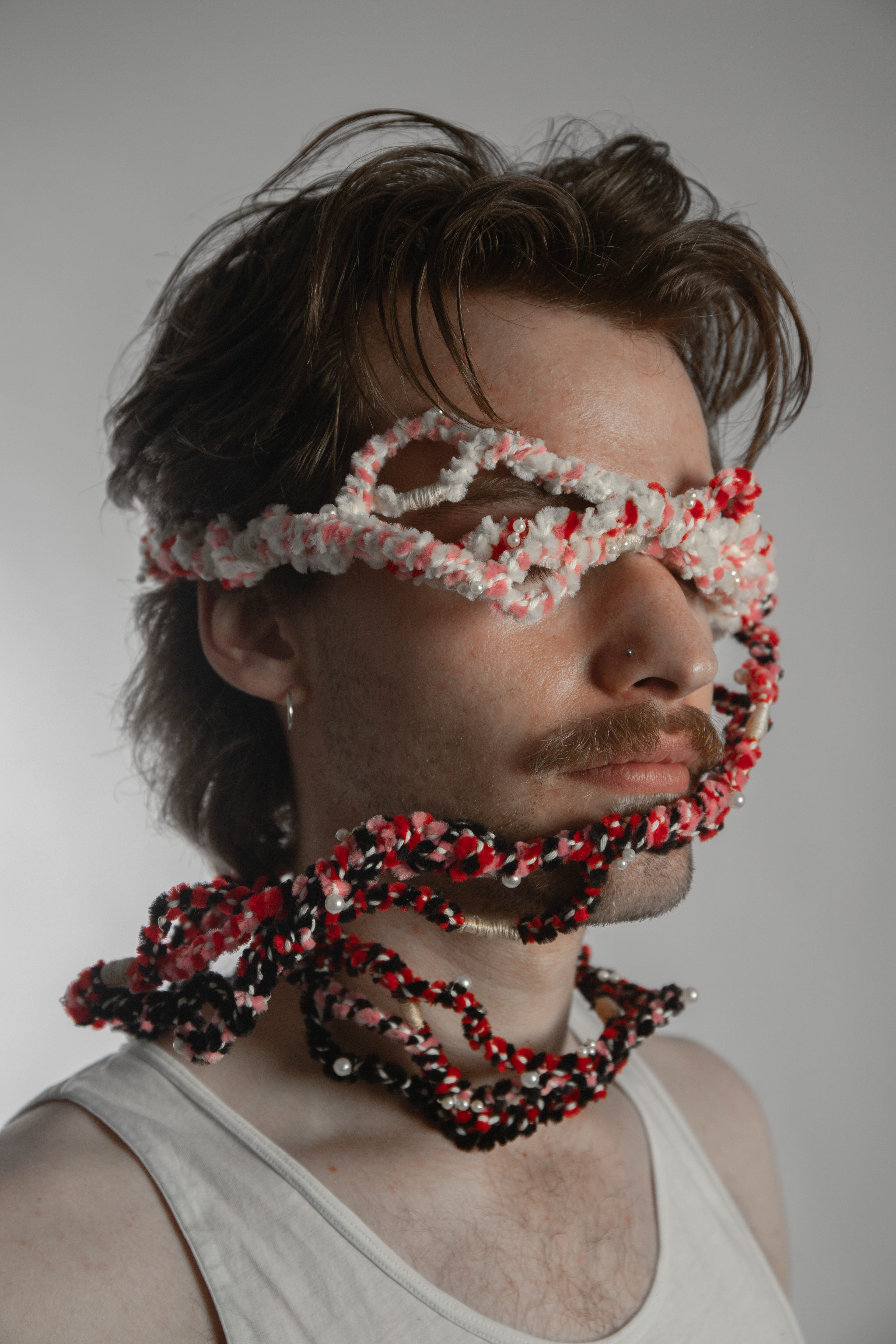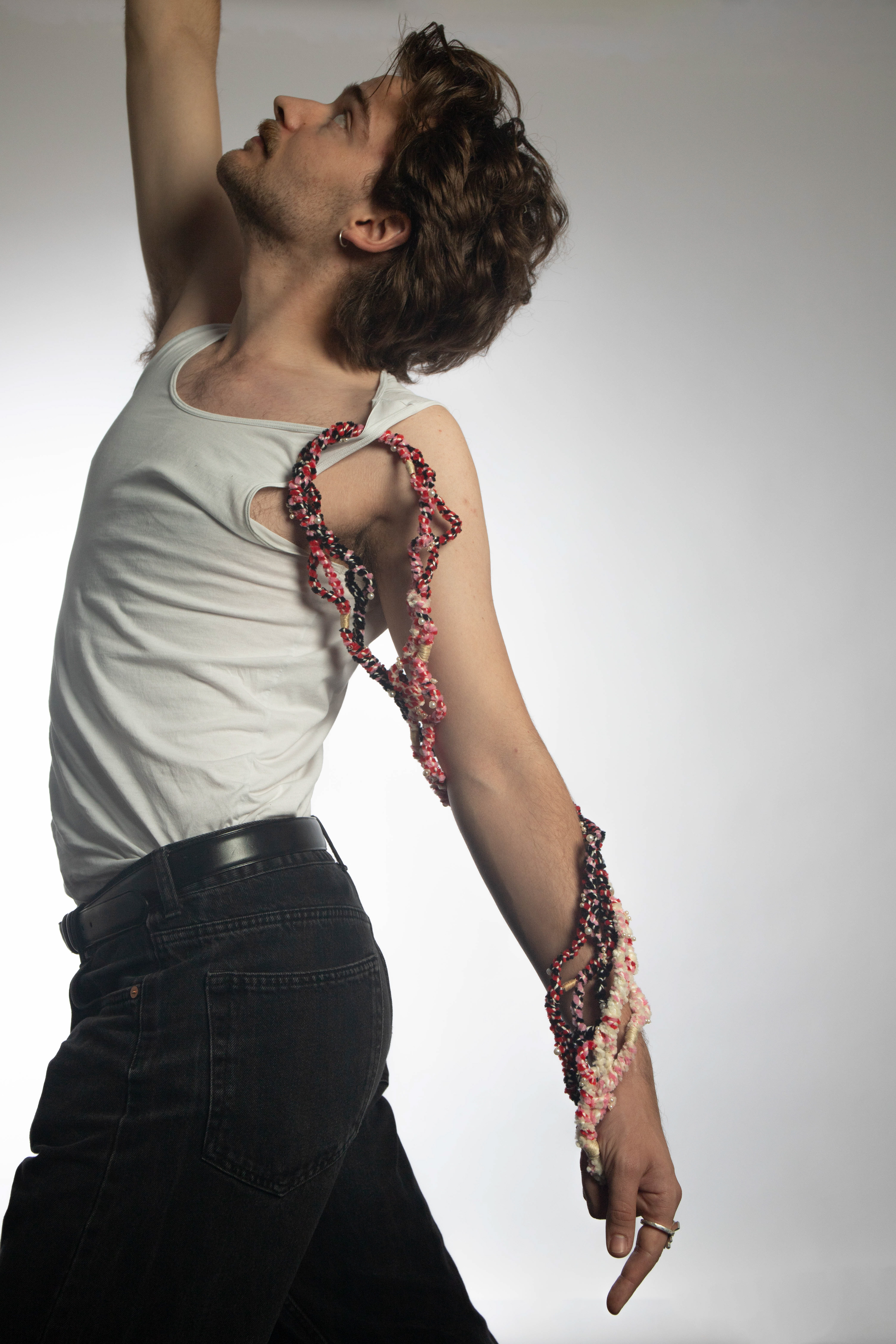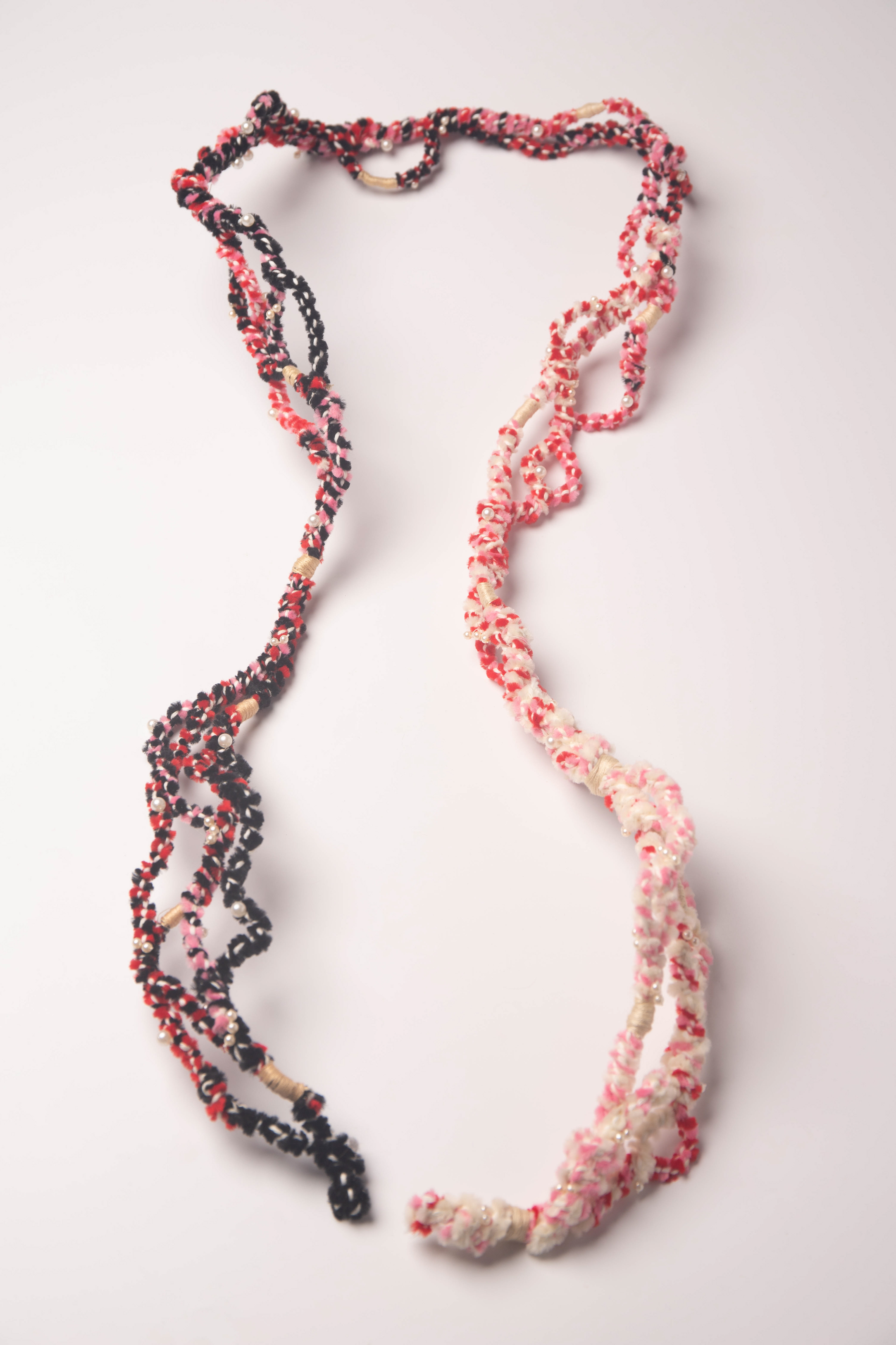 Intertwined² is an exploration of textile material in the form of threads and wire. By repetitively twisting the individual parts together, a whole is created that can no longer be seen as individual parts. The connections are broken and come together again in a fluid state. A very undefined object, whose final act is to twist around the person wearing it.